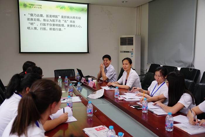 下午,徐春军副院长为大家做了一场“明医之道”专题讲座。“儒乃达儒,医是明医”,在弘扬我院“仁术勤和”院训的同时,告诫营员们,行医不仅要明医理,更要明方药,明人情。营员们都是即将毕业的本科生,教育支部王红梅书记邀请了博士研究生孙旭、硕士研究生邵飞介绍自己的研究生生活,并向营员们介绍了三年来教育处以“教书育人”为核心,开展的丰富多彩的学生活动。(教育处)