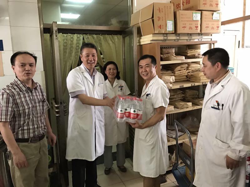 高温岗位职工的安危也牵动着院领导的心,副院长王国玮、药学部主任吴剑坤、后勤党支部书记张智武、药剂党支部书记杨力等到一线慰问在岗职工,向冒着炎热高温奋战的工作人员表示敬意和慰问。先后来到门诊代煎室、职工食堂、门诊饮片药房及病房煎药室等,与大家亲切交谈,叮嘱一定要多喝水,科学调配工作时间,注意防暑降温,并为大家送上清凉饮料等消暑饮品,对广大职工不畏高温、辛勤工作的爱岗敬业精神表示充分肯定和赞赏。并号召我院全体员工向他们学习,努力工作,服务患者。(药学部)
