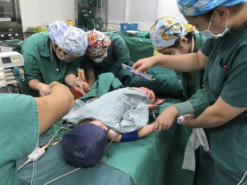 为了减轻孩子的恐惧心理,尽量地安抚孩子,本来应该由一位巡回护士就可以完成的术前工作,大家纷纷进来帮忙,配合麻醉、手术、安抚孩子,用手机给孩子播放动画片,跟孩子聊天,夸她真乖真勇敢......直至麻醉插完管,孩子都特别配合,一直由各位阿姨陪着各种开心的笑,连输液扎针都很配合,没有害怕喊痛。