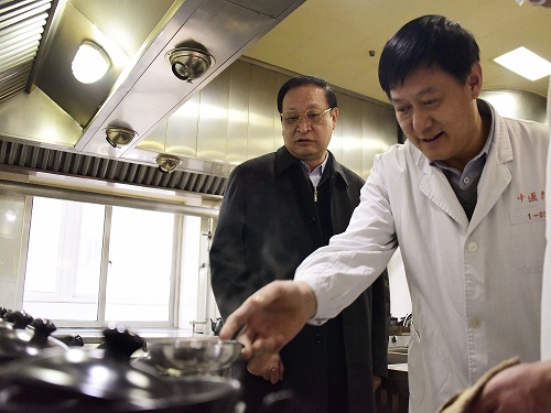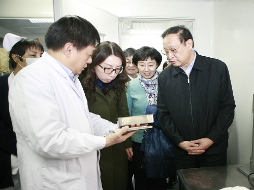 随后,王国强一行来到门诊中药饮片调剂室,看望工作在一线的药师们,他详细询问中药调剂的工作情况,同时强调了准确调剂、严格复核的重要性。在病房煎药室,王国强一行观看了“小锅煎药”的过程。当得知一位煎药师同时负责8个煎药锅,一天煎煮近五百锅汤药时,他说:“煎药室常年高温高湿,工作费时费力,但这项工作很重要。煎药质量是保证疗效的最后一关,一定要把握好。大家辛苦了!”