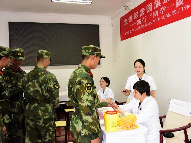 在中国共产党建党95周年到来之际,我院门诊、药剂、离退、后勤党支部联合组织党员、职工来到武警北京总队天安门警卫支队举办“走进军营国旗班 共助健康中国梦” 践行“两学一做”主题党日义诊咨询活动。