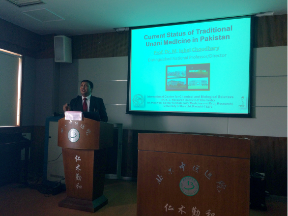 Iqbal教授现任巴基斯坦科学院院士、第三世界科学院院士、巴基斯坦化学协会秘书长。主要从事天然产物化学研究,发表SCI论文超过200篇。他首先为大家介绍了巴基斯坦传统医学——Unani医学的起源、发展、理论及应用现状,并介绍了国际化学和生命科学中心(ICCBS)的科研与教学情况,他表示巴基斯坦人民对中国非常友好,热烈欢迎医院的专家、学者到卡拉奇大学参观、访问、交流。刘新民教授现任世界卫生组织传统医学顾问,是世界卫生组织“草药-药物相互作用技术指南”编制的首席专家。主要从事中药神经药理和毒理研究、动物行为实验方法学研究以及中医药现代化研究等。刘新民教授的讲座内容丰富详实,让到场人员对我国中医药现状以及中医药在世界各国和地区的现状有了深入认识。