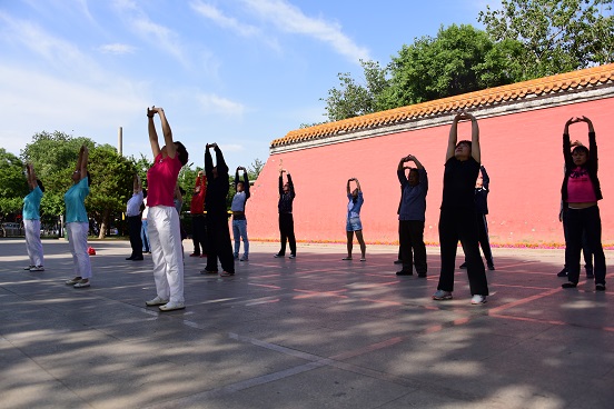 周冬梅主任医师还向大家推荐了通过健身放松身心的方法,并简要的介绍了八段锦和太极拳的健身作用,特别强调了,银屑病患者可以通过这两种锻炼方法对身心的不平衡状态进行有效的调理。随后,北京中医医院皮肤科护士长龚永红、护士胡薇、任丽媛带领大家一起学习了中国传统健身操——八段锦,皮肤科特邀专业教练朱建辉老师为大家讲解及演示了行云流水一般的24式太极拳,几位老师的动作姿态优美到位,获得了阵阵掌声。一个小时的讲座一眨眼就过去了,带着交流的愉快,和一点点的兴奋,大家一起来到皇城根遗址公园的小广场上。北京中医医院皮肤科的医生、护士,以及健身教练、众多患者一起演练八段锦及24式太极拳,在古朴优雅的音乐声中,医患双方都体会到身心健康的意义,领会到个人和群体和谐的快乐。