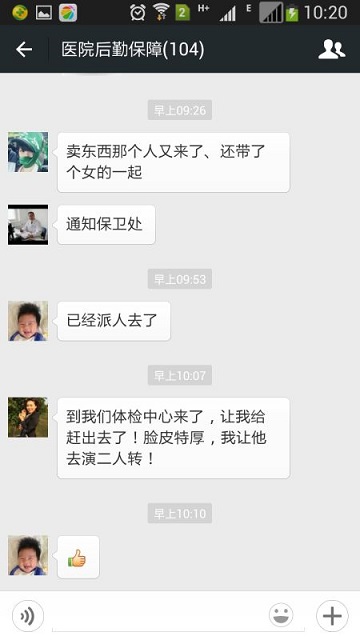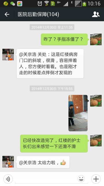 该微信群现有群用户100余人,包括总务处工作人员,还涵盖了医工部、信息中心、保卫处、财务处、药学部等和后勤保障工作密切相关的职能处室人员,以及各科室护士长、各支部书记。运行中体现四大优势。”一是及时高效。后勤维保有两大难,报修难是之一。问题在该谁负责?电话多少?维修人员在不在?什么时间能到现场?等等,这一切在微信上可以随时沟通、实时解答,同时做到谁的“孩子”谁抱走。二是信息准确。后勤维保的第二难,执行难。源于报修人和维修人信息的不对等,经常是维修人员急匆匆赶到现场后,发现信息出现偏差,工具、配件不齐备,甚至不是自己职责范围内的等等,空跑一趟,效率低下。微信的拍照上传功能解决了这一难题。清晰的图片为维修人员提供了明确的判断依据,节省了人力物力,信息准确,效率更高,资源更能有效利用。三是便于管理。微信群是一个公开的平台。是哪个部门负责的问题,什么时候能办结,不能及时完成的原因是什么,便于对问题及时跟进、反馈,避免了各部门之间互相推诿的现象,解决了“中梗阻”问题,不同部门之间更加团结协作。同时,微信群也是一个小型的电子档案库,与传统的维保登记相结合,实时监管,实时统计分析,方便管理,也利于监督考核。四是功能齐备。微信群不仅仅是报修功能,还兼备了安全预警、安全宣教、隐患排查等功能。