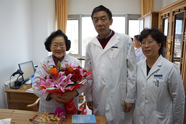 12月24日,是我院国家级名老中医陈彤云老人93岁生日,上午九时许,信彬书记带领门诊部、离退办的同志,来到我院明医馆,代表院党委为仍在出诊的陈老祝寿,给陈老送上鲜花等生日礼物,感谢陈老对我院付出的辛勤和汗水,祝愿老人健康长寿、晚年幸福。陈老激动万分,紧紧的握住信彬书记的手,表示院领导和院党委这样关怀,我一定健健康康,多为医院和患者做贡献,让更多的皮肤病患者远离病痛。
