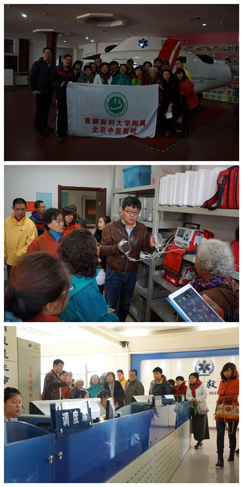 大家登上北京急救中心大厅展览的医用急救直升机模型,了解其先进救助设备和功能。参加了“人工呼吸”,“心肺复苏”等急救知识培训。参观了位于急救中心最高层的“北京紧急医疗救援指挥中心”,现场感受了急救中心医护人员紧张工作的场景。 (团委)