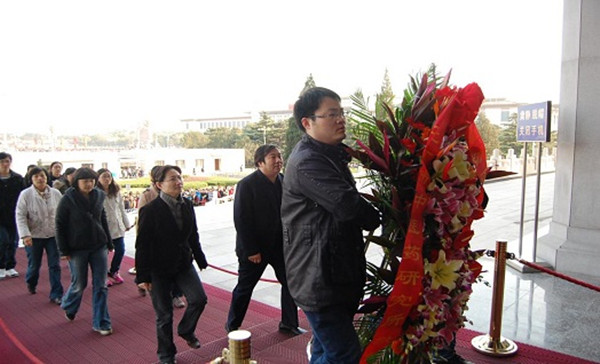 全体同志首先向毛主席汉白玉座像敬献花篮、深深三鞠躬,以表达对伟人的敬意。缓步走进陈列主席遗体的大厅,鲜红的地毯中央停放着水晶棺,毛主席身上覆盖着党旗,平静而慈祥。大家深深地致敬,默默地离去,依依不舍的双眸倾诉着对毛主席的敬爱。之后来到位于纪念堂二层的电影厅,听取毛主席纪念堂管理局负责同志关于纪念堂建立与发展历程的介绍,聆听讲解员深情朗诵的诗歌《思念的河》,观看文献纪录片《怀念》。忆古思今,领袖的丰功伟业和伟大人格深深烙在大家的心中。毛泽东纪念室和收藏精品陈列室里,陈列了大量与老一辈革命领袖有关的珍贵老照片、历史文献和实物,一件打满补丁的旧棉衣、一篇写满伟人亲笔批注的经典文章,无不展现了毛主席朴素伟大光辉的一生。