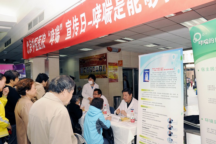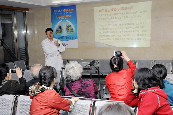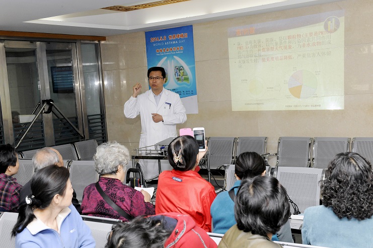 5月6日是国际哮喘日,我院呼吸科与预防保健科在门诊大厅联合举办了义诊咨询活动,副院长王国玮,临一支部书记赵兢、呼吸科主任王玉光、主治医师陈明、祝勇、孟广松、护士长刘宏锦参与。二楼开设健康讲座,王玉光主任、郭丽娅医师就《雾霾与哮喘》、《如何做,哮喘才能达到良好控制?》、《肺功能和FENO在哮喘诊治中的作用》做了专题演讲,并为患者答疑解惑。护士赵海萌为大家讲解了各种吸入装置的使用方法及注意事项。