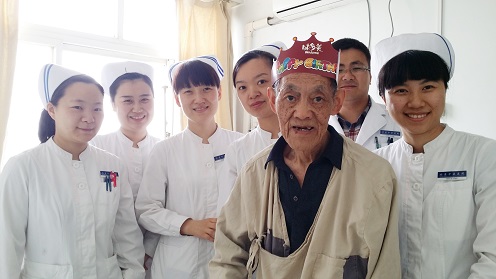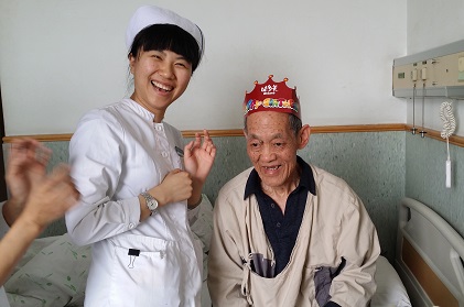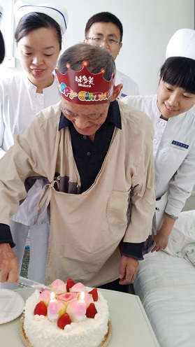 4月18日是“福芝爷爷”80岁的生日,护士长提议咱们为爷爷过生日吧!大家积极响应。趁着午休的时间为福芝爷爷订了一个温馨的小蛋糕,蛋糕上面的图案都是用小寿桃构成,特意在中心摆了一个寿字,还有80字样的蜡烛。内科总护士长李倩,主治医师汪正芳,护士长白京华及科室护士一起来到爷爷床前为爷爷点燃了蜡烛,“福芝爷爷”在吹蜡烛的那一刻,我们看到了他脸上的喜悦,也看到了他眼里的泪花,这份感动我想福芝爷爷是由心而发的。