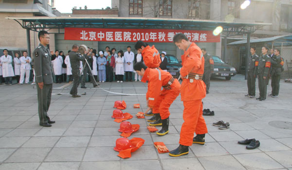 11月3日,“119”消防日前夕,为配合北京市第20个“119”消防宣传周活动,首都医科大学附属北京中医医院组织全院安全员、义务消防员、基干民兵进行了消防安全知识培训。邀请北京市消防总队防火专家为大家做防火知识讲座。医院义务消防队进行了消防演练。图为演练现场。