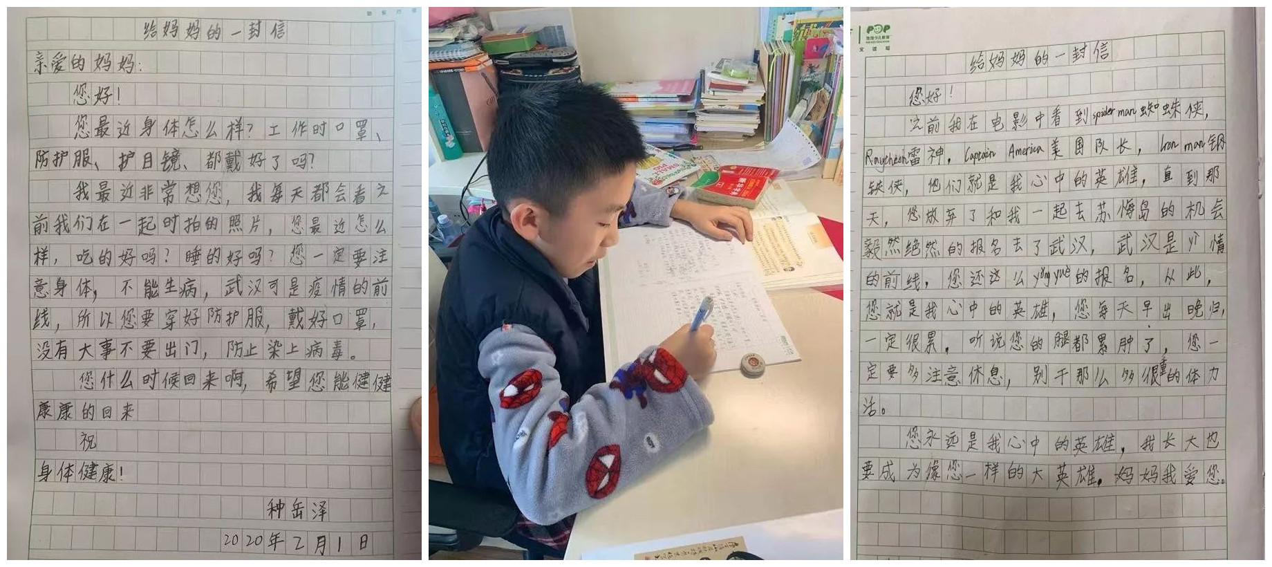 近日,北京驰援武汉医疗队队员张芳芳收到9岁儿子的来信,她明显感觉到那个小男孩变得坚强勇敢了,像个大男子汉。下夜班后,回到驻地,她提起笔为儿子写了一封回信。