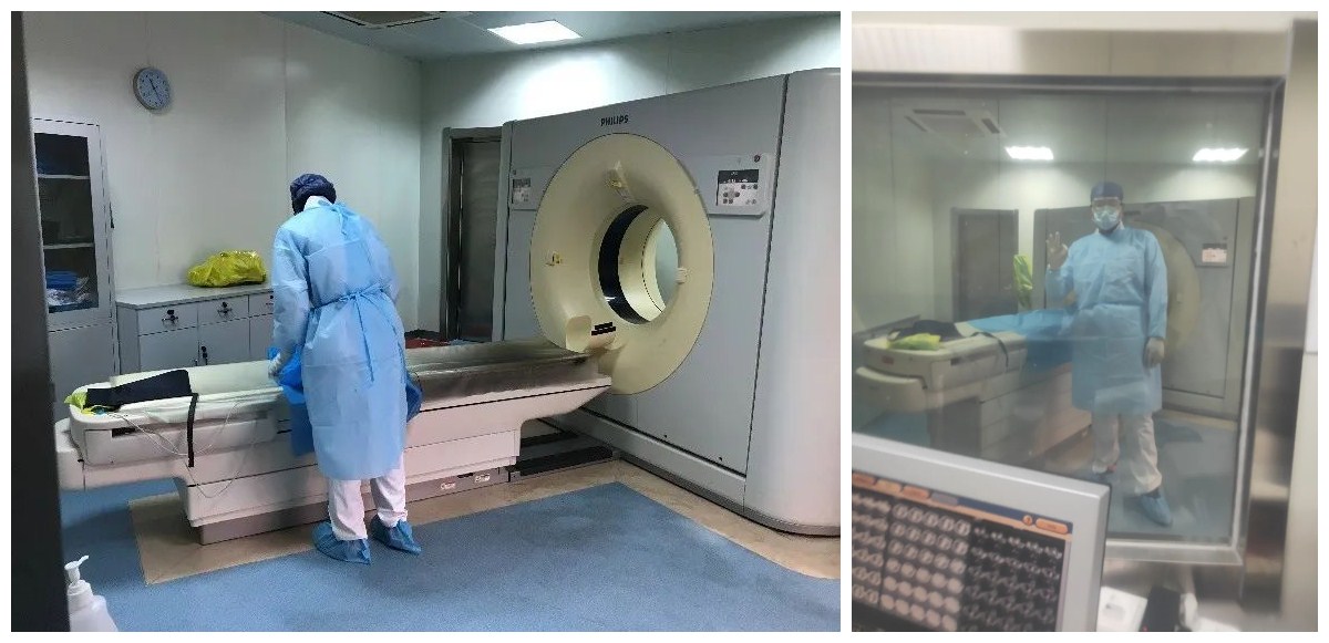 医生组将工作场地转移到操作间,旨在减少患者扫描等待时长,便于快速确诊;护士组轮流值守,严格检查技师穿脱隔离衣每一个细节,不厌其烦地随时提醒,确保防护到位!