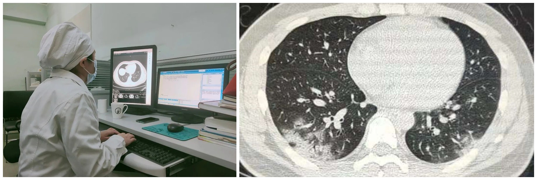 诊断组医师们在防疫最前线不忘初心,坚持学习。对于疑似病例,科室坚持“三第一”原则:第一时间上报科主任;第一时间联系临床医师,明确病史;第一时间劝留病人,避免患者随意走动扩大感染。他们利用业余时间积极开展业务学习,反复研讨新冠肺炎的特殊影像表现,对于可疑病例,全科组织讨论,用火眼金睛发现屏幕前的病情、用灵犀双目精确识别每一处病变!