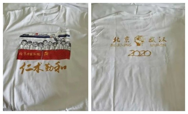 3月的武汉气温飚到25度,队员们出发时带的冬衣已经穿不住了。于是,利用出征漫画定制原创文化衫的想法应运而生。文化衫的正面是手绘漫画和院训“仁术勤和”四个大字,背后是记录了北京、武汉两个城市和2020的年份,中间紧紧相握的双手更是体现了两地医护共风雨、渡时艰的深刻缘分。