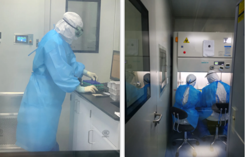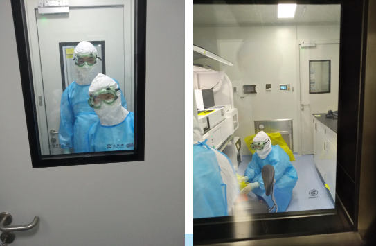 核酸检测方舱从筹建到落成使用,历时20余天。期间,各部门通力合作,争分夺秒。检验科未雨绸缪,培养人才,先后选派多批人员参加《临床基因扩增检验实验室规范化培训班(远程)》理论及实验操作培训,19人通过考核并取得核酸检测上岗资格。