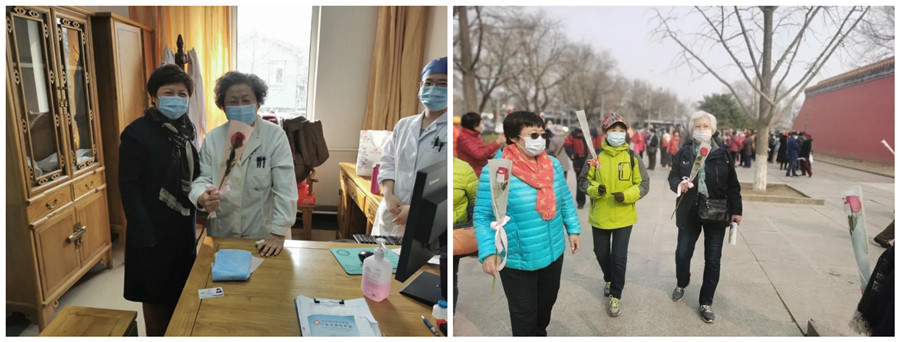 党委专职副书记温淑兰参加健步走活动,并带领离退办工作人员看望在明医馆出诊的老专家,送上节日的鲜花。代表党委向离退休女同志致以节日的问候,感谢她们为医院做出的贡献。