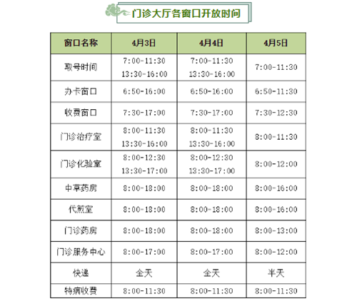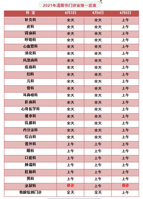 ■节日期间急诊、发热门诊24小时开放,核酸检测门诊4月3日、4日全天开放,4月5日上午开放。