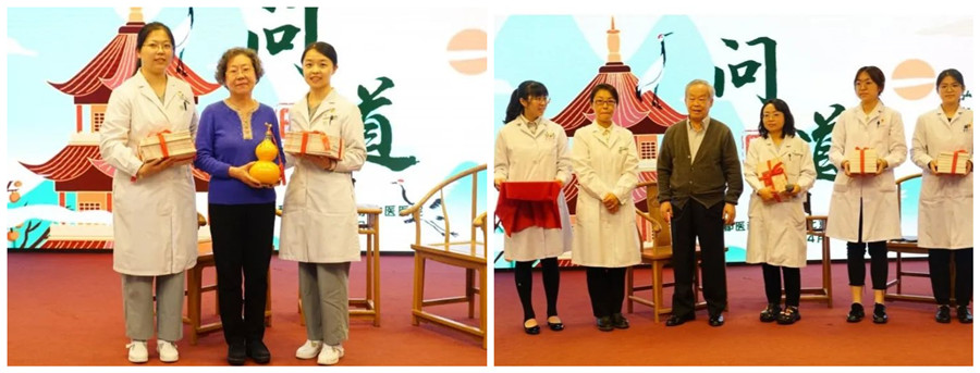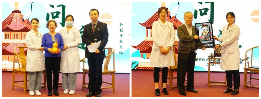 团员青年代表为吕老和王老赠送景泰蓝寿桃纹葫芦摆件及“松鹤延年”图,祝福二老身体健康、福寿绵长、桃李满天下。老专家也向青年代表回赠了临床经验集著作。