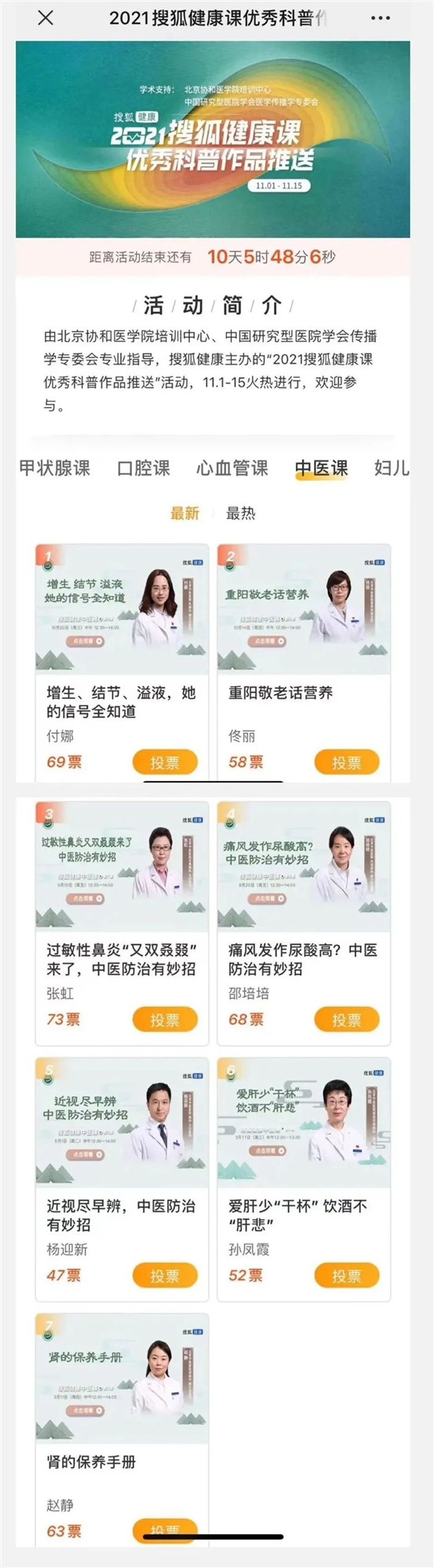 由北京协和医学院培训中心、中国研究型医院学会传播学专委会专业指导,搜狐健康主办的“2021搜狐健康课优秀科普作品推送”活动近日开启投票,我院多位专家的科普直播入围。
