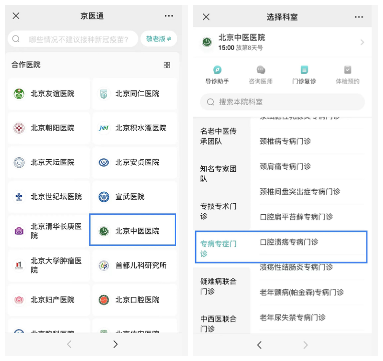 2、北京中医医院-专病专症门诊-搜索“口腔溃疡专病门诊”