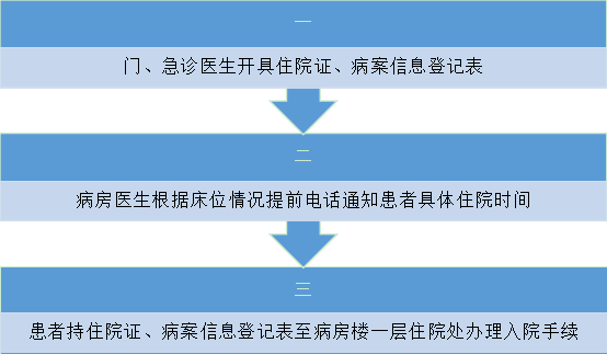 1、办理住院需由门、急诊医生开具住院证、病案信息登记表,病房医生根据住院时间,提前电话通知患者具体住院时间,患者于住院当日持住院证、病案信息登记表至病房楼一层住院处办理入院手续。