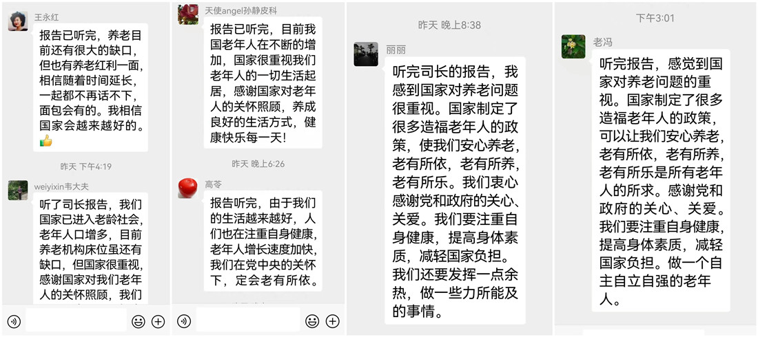 会议强调老龄工作事关国家发展全局,事关亿万百姓福祉,事关社会和谐稳定,对于全面建设社会主义现代化国家具有重要意义。离退休老干部收看了专题报告会后,纷纷分享交流学习体会。