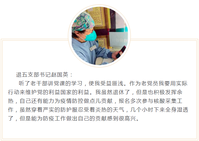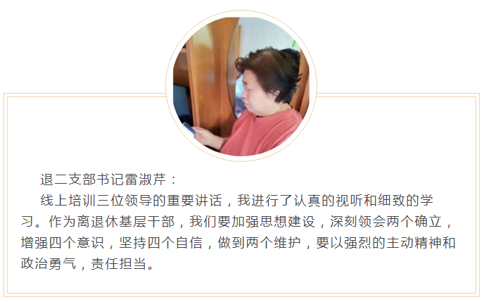 作为离退党员干部,我们必须更加深刻认识“两个确立”的决定性意义,增强“四个意识”、坚定“四个自信”、做到“两个维护”,将对于精神的学习转化为实际行动,充分发挥党员的模范带头作用及党支部的组织动员作用,带领党员带动群众,在当前的疫情防控与首都发展建设中作出积极贡献。