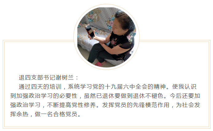 通过本次培训学习,让我对党的十九届六中全会精神又一次深入了解,认识到作为一名党员,始终要保持共产党的高尚情操与革命气节,要深入学习共产党的百年历史,加强政治学习,提高理论素质,继承发扬中华民族的优良文化和传统美德。