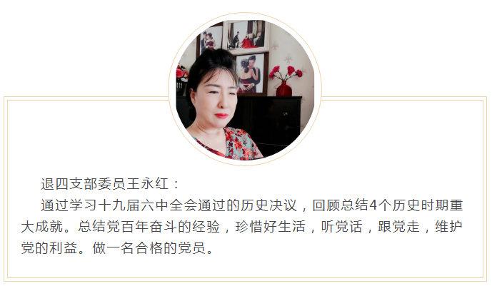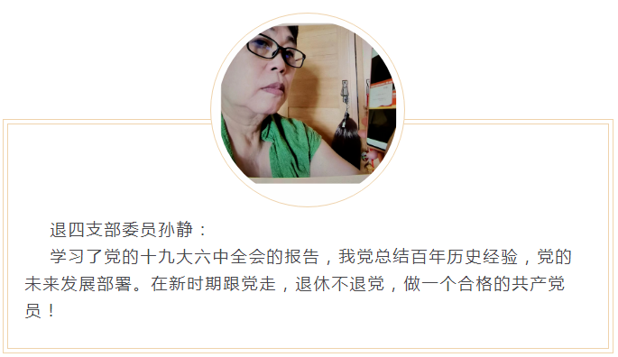 作为退休老党员通过这次学习党的十九届六中全会公报,感受到号召振奋人心,我们要更加紧密地团结在以习近平同志为核心的党中央周围,大力弘扬伟大建党精神,奋斗百年路,启航新征程,就一定能焕发出更加璀璨的时代光芒。