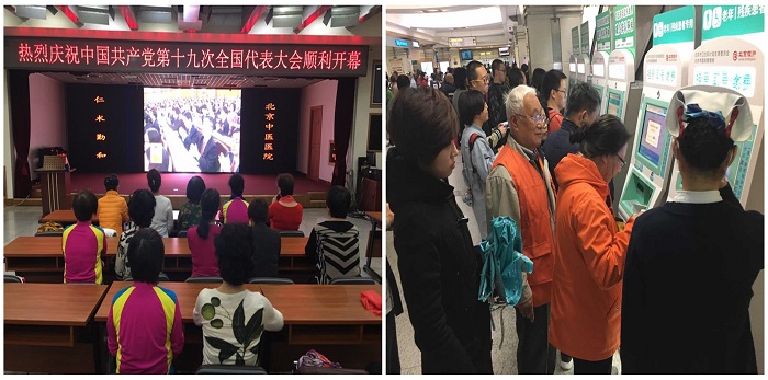 我院部分离退休干部在医院集中观看党的十九大开幕会直播,老党员先锋队队员以门诊志愿服务的方式庆祝十九大的胜利召开。