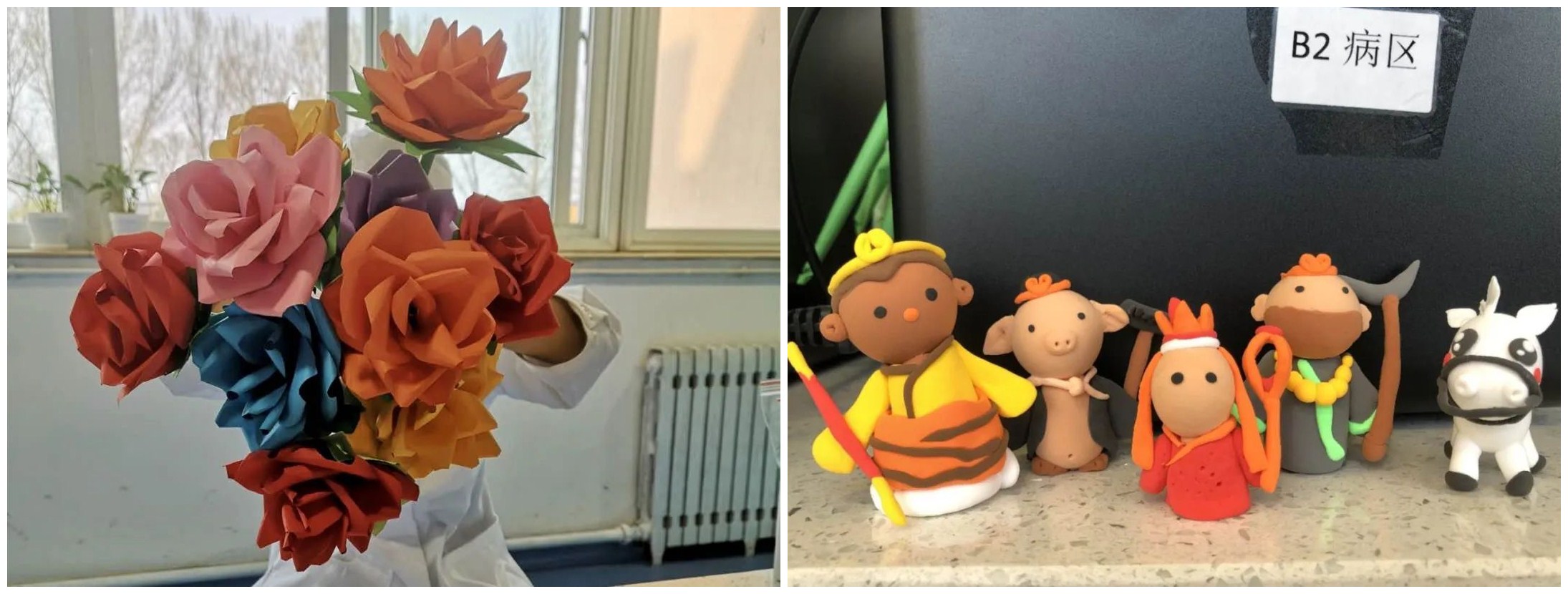 请欣赏:队员们用亲手制作的彩陶和折纸为患者带来心灵上的治愈,为隔离病房带来暖暖的春意。