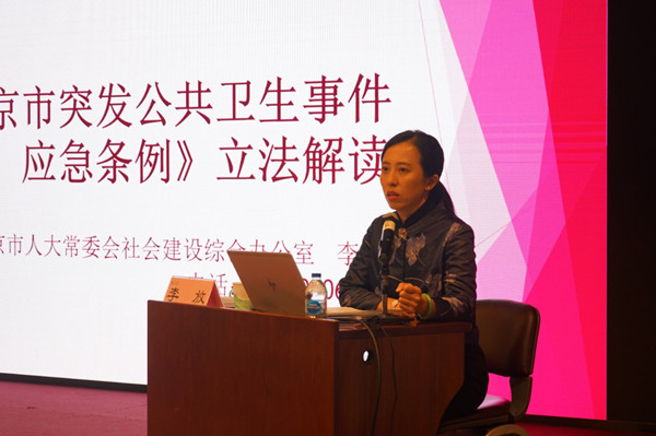 北京市人大常委会社会建设综合办公室主任李放讲授《北京市突发公共卫生事件应急条例》立法解读,阐释了条例的立法背景、起草过程、思路内容,以及条例出台的影响,对医院相关工作的开展和改进起到重要指导作用。