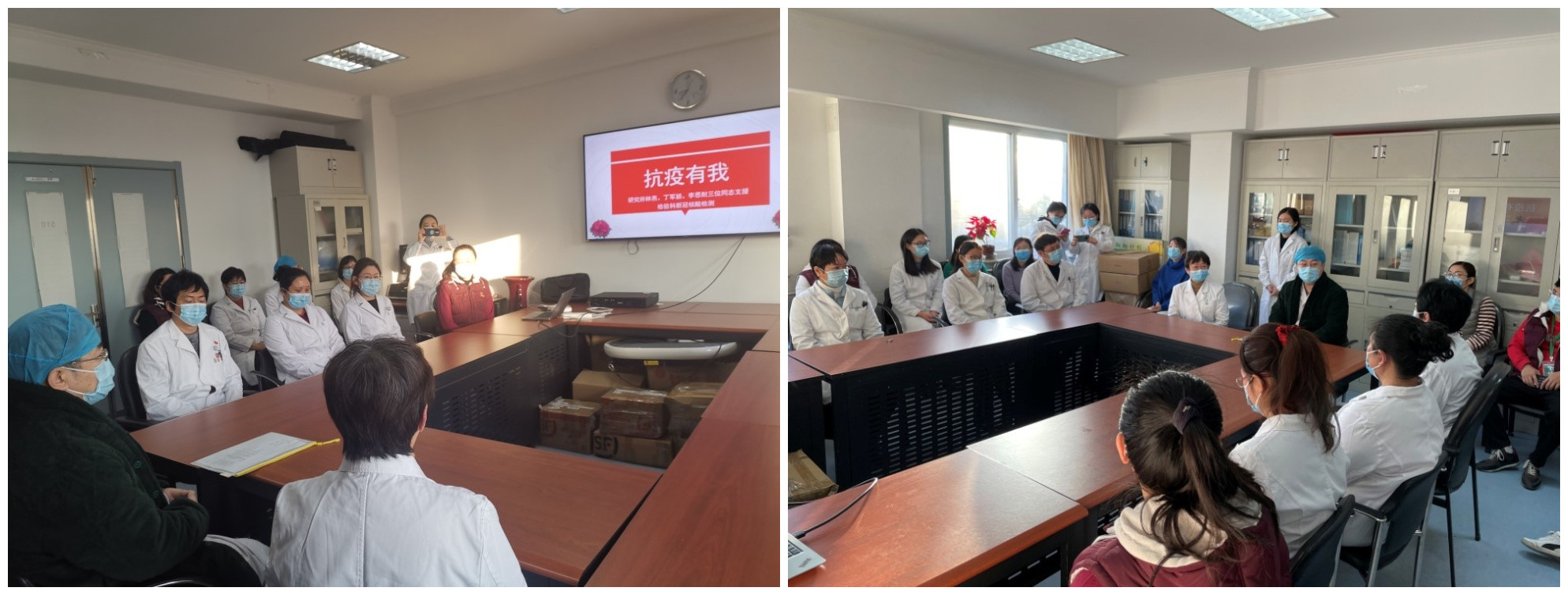 三名同志纷纷表示会不遗余力、不折不扣地完成党组织交给的任务,请领导放心。随后,许越之书记、李萍副所长、赵京霞主任等一同将三名同志带到检验科,与洪燕英主任做好交接工作。洪主任对研究所的大力支持表示由衷感谢,希望同研究所一道做好医院的抗疫工作。