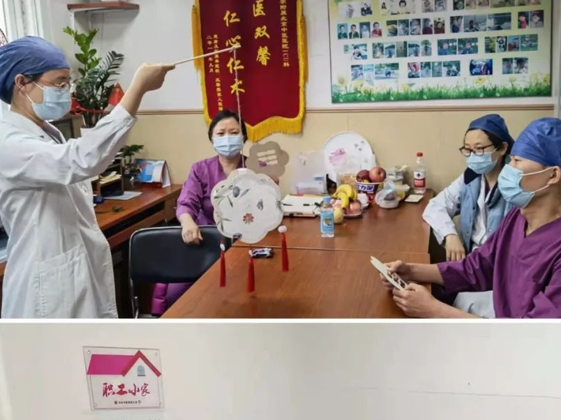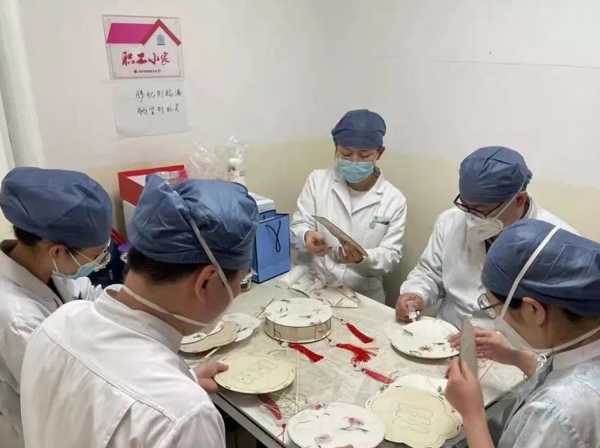 为缓解职工身心压力,院工会不定期组织不同形式的职工团体减压活动,包括插花、手工缝制香囊、制作护手霜、“水拓真丝扇面”等各种舒缓的手工制作类项目,让高应激状态下的医务人员放松压力、舒缓身心,深受职工欢迎。