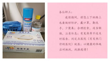 给在岗职工发放洗手液、湿巾、帽子、手套等防护物品,同时附上疫情期间对职工的慰问,以及注意事项,提醒大家疫情期间做好个人防护,帮助员工提高自我保护能力。