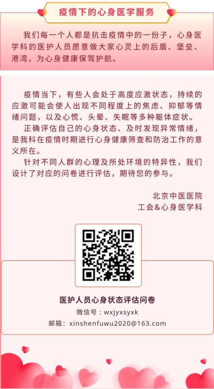 疫情期间,很多职工都处于高度应激状态,持续的应激可能会使人出现不同程度的焦虑抑郁等情绪问题,以及心慌、头晕、失眠等多种躯体症状,针对这一情况,院工会联合心身医学开展了职工心身健康筛查和防治工作,提供心身调适建议。
