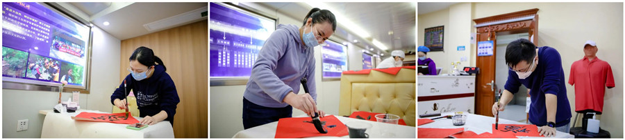 退休职工王鹤泳、肛肠科李宇栋、继教办徐跃、运管处刘惠文、医工部田爽、中药房白燕、保卫处钱凯荣等职工现场挥毫泼墨、笔走龙蛇,累计书写春联三十余幅、福字近二百张。