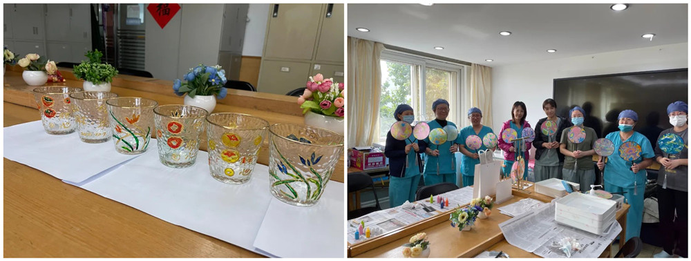 医者仁心、护者温情。疫情常态化防控形势下,医务人员一手抓医疗卫生,一手抓疫情防控,没有丝毫松解。为让高应激状态下的医务人员放松压力、舒缓身心,我院各分会在9月~10月开展了职工团体减压活动,包括“琉璃金丝彩画杯”、“马赛克花瓶”、“永生花桌摆”、“水拓真丝扇面”等手工制作活动。