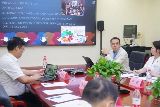 刘清泉教授介绍中医药传统疗法在重症病人的治疗的优势作用。与会专家座谈交流,为更好促进中国北京与伊朗德黑兰在传统医学方面的深入合作展开研讨。