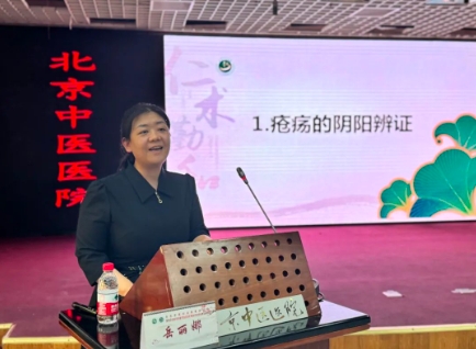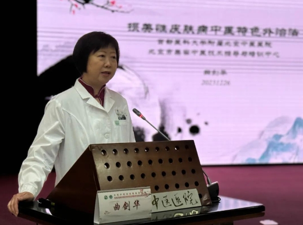 北京市优秀名中医、皮肤科曲剑华主任医师做了题为《损美性皮肤病中医特色外治疗法》的授课,分享了燕京皮外科特色外治疗法的组方药材、治疗要点、注意事项、适应症与禁忌症,并介绍了我院陈彤云系列化妆品创新科技成果转化取得的成绩。