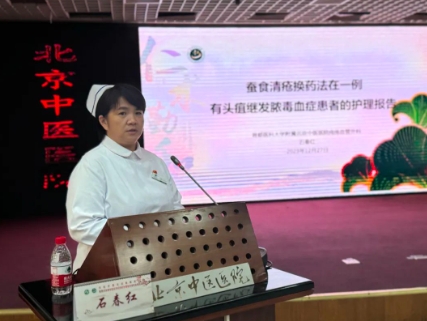 在个案分享环节,燕京乳腺护理门诊负责人梅雪婷、燕京疮疡护理门诊负责人岳丽娜、疮疡血管外科护士长石春红分别做了题为《燕京乳腺特色疗法在乳腺癌术后上肢淋巴水肿应用》、《阴症疮疡的辨证施护》、《蚕食清疮换药法在一例有头疽继发脓毒血症患者的护理报告》的分享。