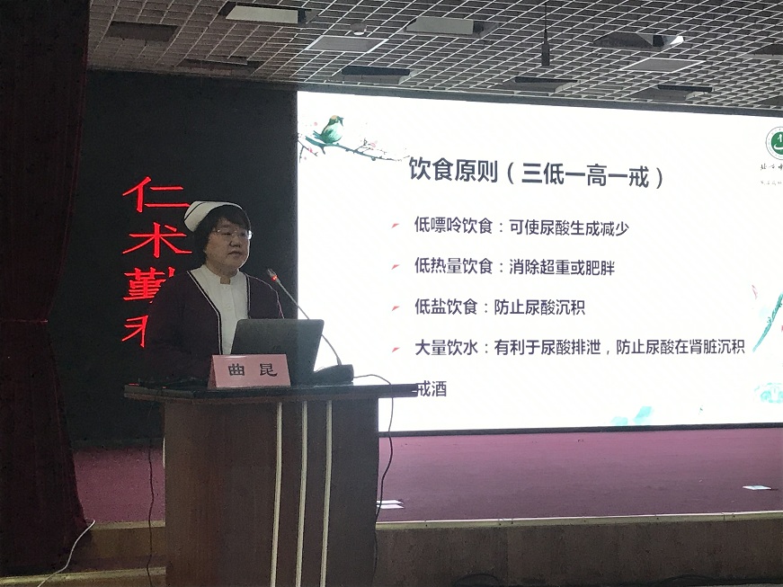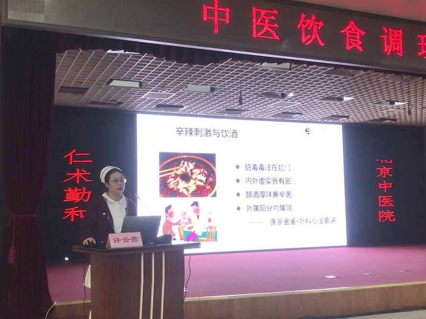 随后,专家们带来了精彩的报告。王国玮副院长结合《黄帝内经》中的理论基础和工作中收集的典型案例为学员深入诠释了中医整体观念、辨证论治和阴阳五行的理论体系;张洪君理事长用自己几十年做科普的经验讲解了《如何有效科普自己的专业知识》;北京中医药大学的林殷教授为学员普及了《中医饮食养生理念与保健方法》;清华长庚医院的沈犁副主任作题为《糖尿病饮食原则与实践指导》的专题报告;北京医院肝胆外科护士长李磊讲解了《老年患者临床营养支持及社区衔接》;广安门医院国际合作办公室主任崔永强提出《健脑、减压食物都有科学依据》;我院疮疡科护士长石春红讲授《丹毒的中医饮食护理》;风湿科护士长曲昆讲授《痛风患者的饮食护理》、肛肠科护士长许云霞讲授《知常达变—肛肠疾病中医饮食调护的“常”与“变”》。