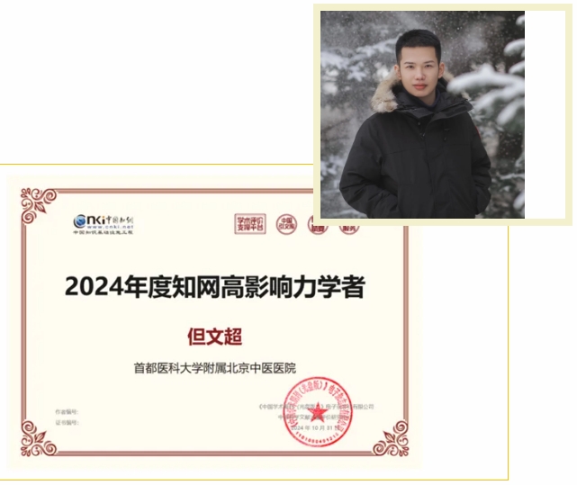 在近日公布的2024年度知网最具影响力学者与知网高影响力学者名单中,在读博士但文超获评“2024年度知网高影响力学者”称号。评选最具影响力学者的PCSI基线数值为120.315,高影响力学者的PCSI基线数值为42.011。目前在读博士生但文超的PCI数值为112.45,其第一作者的论文单篇最高被引次数120,最高下载次数15260,2篇科研论文入选 “三高””(PCSI论文、高被引论文、高下载论文),另有6篇获高下载论文,获评论文主要领域属中医药信息学或中医理论探讨。