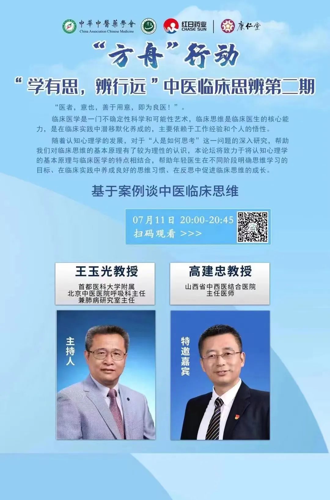 第2期论坛将于7月11日晚8点进行线上直播,邀请著名东垣学说研究者、山西省中西医结合医院高建忠教授主讲《基于案例谈中医临床思维》。