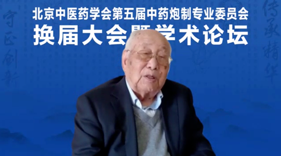 国医大师金世元教授通过视频致辞,希望新一届中药炮制专委会继续发扬老一辈中医药人的优良传统,为北京中医药事业的发展再立新功。