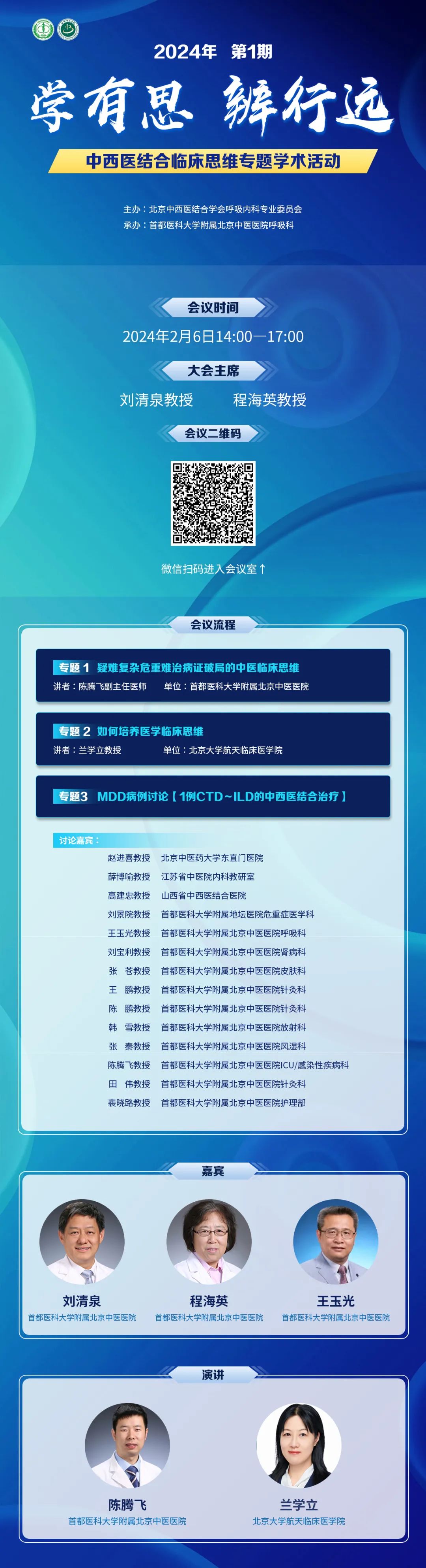 2月6日,由北京中西医结合学会呼吸内科专业委员会主办,首都医科大学附属北京中医医院呼吸科承办的“学有思辨行远”论坛2024年第1期即将召开。