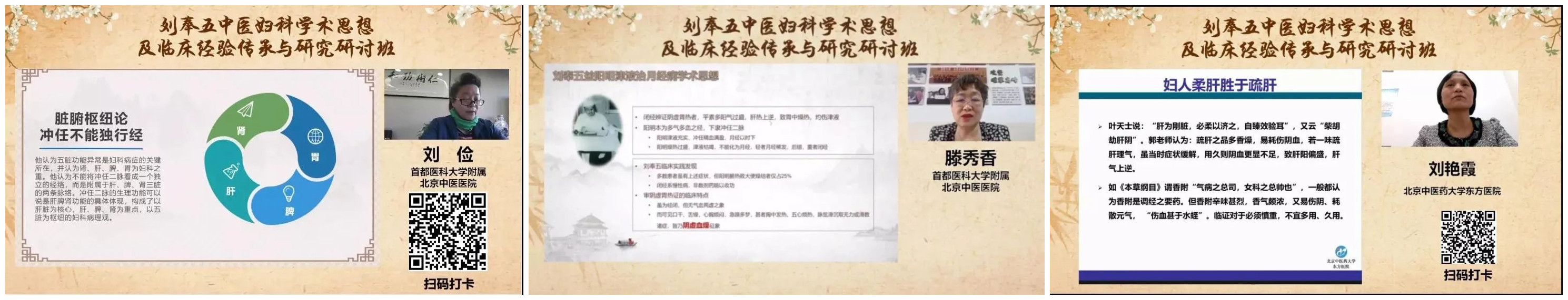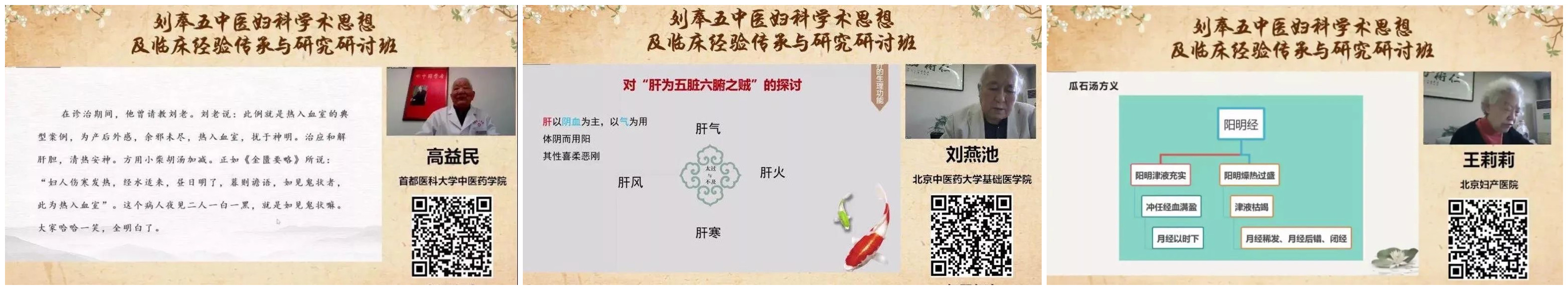 首都医科大学中医药学院高益民教授讲述《我敬佩的中医妇科专家刘奉五》;北京中医药大学基础医学院刘燕池教授对“肝为五脏六腑之贼”和“冲任不能独行经”进行了深入探讨;北京妇产医院王莉莉副主任医师讲述《刘奉五“瓜石汤”治闭经临床经验》;我院刘俭副主任医师作题为《忆我的父亲刘奉五》的报告,阐述了刘老的脏腑枢纽论、治肝八法、治血八法、治汗四法,并对“解毒内消汤”、“清热平肝汤”、“凉血止衄汤”等经验方进行详细讲解;滕秀香主任讲授《从“瓜石汤”谈刘奉五益阳明津液调经之法》;东方医院刘艳霞教授讲述《郭志强教授应用养血柔肝法治疗妇科疾病的经验》。