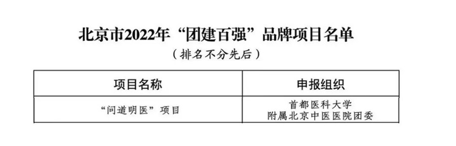 自“团建百强”项目2022年3月启动以来,北京中医医院“问道明医”名老中医药专家系列访谈品牌项目经过初筛审核、网络投票以及专家和社会代表评审等环节,在北京市卫生健康委员会、北京市医院管理中心等上级单位的关心支持下,最终被评选为北京市2022年“团建百强”品牌项目!