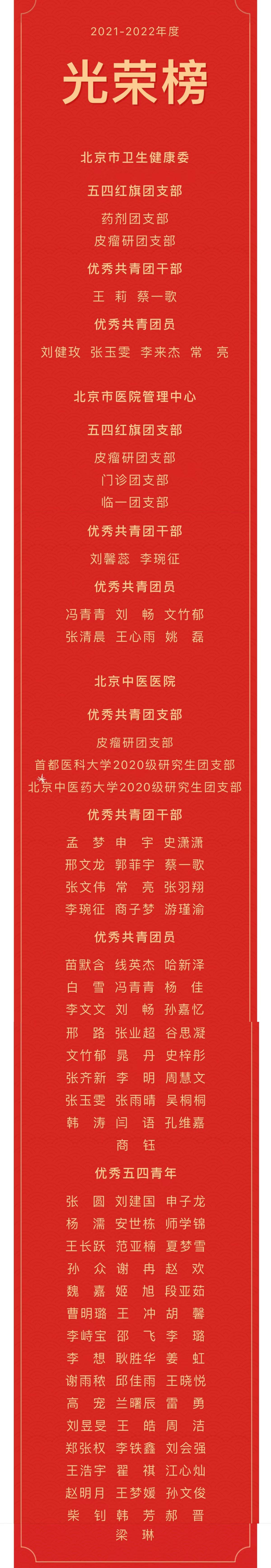 为选树宣传先进集体和个人,激励各团支部、团员及团干部立足岗位、创先争优,根据北京市卫健委《关于开展2021-2022年度市卫生健康委“五四红旗团委(团支部/团总支)、优秀共青团干部、优秀共青团员”评选表彰工作的通知》、北京市医管中心《关于开展2021-2022年度市医院管理中心“五四红旗团委(团支部/团总支)、优秀共青团干部、优秀共青团员”评选表彰工作的通知》、北京中医医院《关于开展2021-2022年度北京中医医院共青团先进集体及个人申报工作的通知》要求,由各团支部推荐、院团委审核并经院党委会讨论决议,全院范围内评选出优秀共青团支部、团干部、团员及五四优秀青年。具体获奖名单如下: