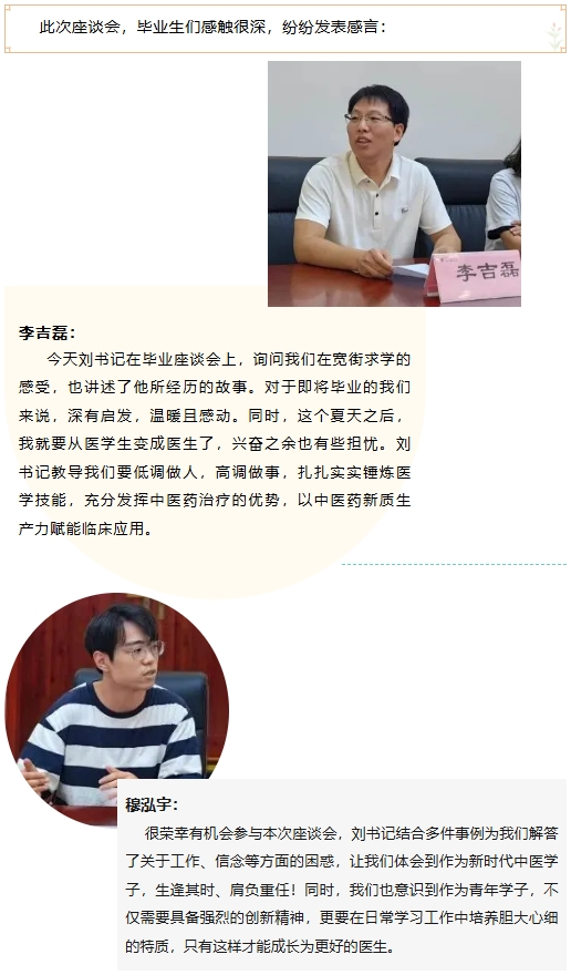 来自首都医科大学2021级研究生班专业学位博士研究生李吉磊、首都医科大学2021级研究生班专业学位硕士研究生陈佳萍、北京中医药大学2021级研究生班专业学位硕士研究生陈佳祺、首都医科大学2019级中医班本科生穆泓宇、2021级社会规培龚雪鹏作为毕业生代表回顾了在北京中医医院成长经历和收获感悟,并分享了毕业感想及对未来的畅想。毕业生们有的选择继续深造,有的即将步入社会,在面对未来时,他们或多或少都会感到困惑与迷茫,在此次座谈会上,同学们提出了问题:“您对初入职场的我们有什么建议吗?”“您认为一名优秀的医学人才需要具备哪些特征?”刘中勋就像家长一样,耐心地为同学们答疑解惑,为他们指明前进的方向。
